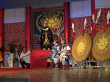 (Trên đồi núi, Kim Vương đang nhìn địa thế và bản đồ đang cầm trên tay. Vũ, Cơ, nhị điện, tam điện đứng hầu) - Chủ ý: cho thấy cách suy nghĩ và đối đáp của Vũ khác với ý muốn của hoàng tộc nhà Kim. Và vì Vũ có cách suy nghĩ quá khác lạ, gần như đối lập lại với Kim vương nên khiến ông lo sợ là Vũ bị “đồng hóa” theo nhà Tống. Vũ càng bình tĩnh đối đáp lý lẽ chống lại việc chiến tranh với nhà Tống, khen ngợi Trung nguyên càng khiến cho Kim vương quyết định phải tiến quân. Một là vì ông muốn chứng tỏ oai quyền của người cha với con, quân chủ với thần tôi. Hai là ông bị tự ái dân tộc khi Vũ mang ý xem thường văn hóa phong tục nhà Kim. - Lời văn: "Nếu không quá hải thì đâu biết được tài hùng cỡi cơn sóng dữ". Các sis có biết câu này Ti lấy ý từ đâu không Triệu Trinh nương nhà Đại Việt mình chứ ai, "cỡi con gió mạnh, đạp đường sóng dữ, chém cá kình ở biển khơi". - Duyên Kỳ Ngộ: cái dồn dập trong điệu này không như tên gọi của nó. Ti khoái những lúc dằn trống ở khoảng cách 2 câu với nhau. Hay là ở chỗ lúc đó giọng ca lên cao giọng ở những âm vần "sắc", hoặc "ngã, hỏi", vừa lên cao là tiếng trống dồn vào nối tiếp với giọng và lên cao trong tiếng đàn, còn giọng thì được ngắt đi. Nghe bài này đúng là giao hưởng giữa giọng ca và tiếng đàn, tiếp nối với nhau không ngừng. Tiếng đàn dồn dập vừa ngừng thì giọng hát tiếp theo. 1 câu nhẹ, 1 câu lên cao rồi dàn nhạc lại dồn vào như vậy lập đi lập lại 3 lần. Khâm phục ai nghĩ ra thể điệu và cách hòa âm này. Quá tuyệt vời! Điệu này bên tuồng xã hội cũng có xử dụng, nhưng dĩ nhiên là theo lối chơi nhẹ, không trống dồn dập, không hùng hồn. Khi nghe điệu này bên cổ nhạc thì thấy nó bình thường không có gì đặc biệt. Nhưng khi chuyển dây qua cách chơi của tuồng hồ quảng thì ... quá đã. Bởi vậy, ai chê bai cải lương phải tân tiến qua chuyện đưa nhạc giao hưởng thính phòng vào để "cập nhật" với thời đại là Ti chịu không thấu. Xời!!! Xưa gồi Diễm ơi, người ta "cập nhật tân tiến" từ mấy chục năm nay òi. Muốn "giao hưởng" theo lối Tây phương hả, 3 cây violins, 1 cello, 1 dàn trống bên Tây chơi với dàn cổ bên mình ... aiya ... nghe hú hồn luôn á. Nhưng! làm ơn đừng chơi giọng thính phòng ... chít thiên hạ nhà cải lương! Khác biệt giữa kịch bản và phim: Kim vương: Con về chuẩn bị binh pháp và tiến quân! (Kim vương đi, tam nhị thích thú nối gót. Vũ hơi bị mất bình tĩnh, thở mạnh như không thể ngờ chuyện đến nỗi. Khi ngước mắt lên thì thấy Cơ đang nhìn Vũ một cách hờn giận, vì Cơ nghĩ Vũ không muốn đánh Tống chỉ vì Lâm Kỷ Vân. Vũ không hiểu Cơ tại sao lại hằn học với mình, ngạc nhiên nhìn Cơ. Cơ giận dỗi bỏ đi.) Ti nghĩ có lẽ vì đạo diễn cho rằng đoạn diễn trên sẽ khó hiểu đối với khán giả nên ông đã làm khác đi. |